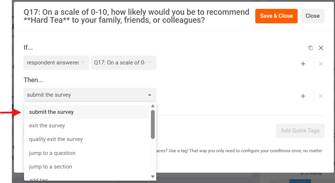 Within your Action Logic options, submit the survey will count the respondent as a complete (not an exit) at the question you designate if they meet your logic conditions. This means respondents don't have to complete your survey all the way to the very end and can finish the survey at an earlier point to be counted as a complete.