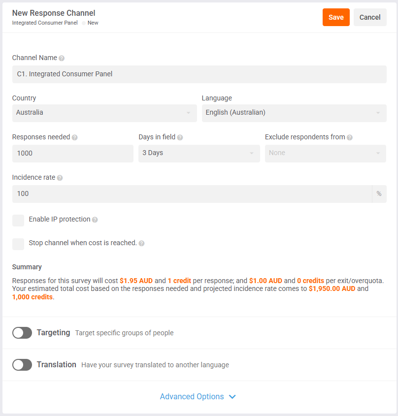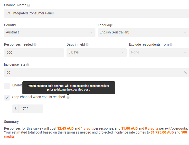 To prevent going over budget, tick Stop channel when cost is reached and input your max channel budget. This will stop the channel when your budget (e.g. $1725) is reached instead of when response limit is reached (n=500).