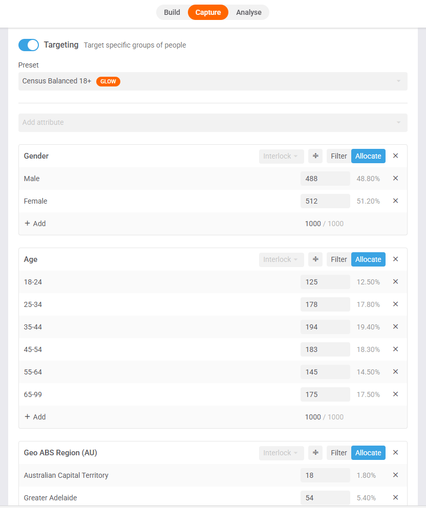 Click Targeting and set your demographic targets. Default is set to nationally representative by gender, age, and location. If you want to change targets, go for it - just ensure your target numbers add up to your Response Limit. If you make a mistake, just select the relevant Preset to revert back.