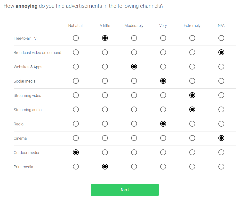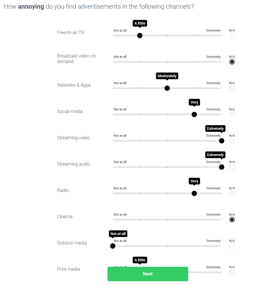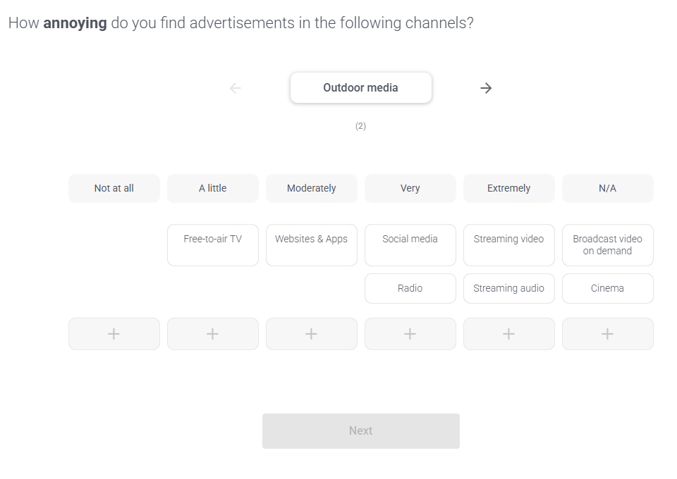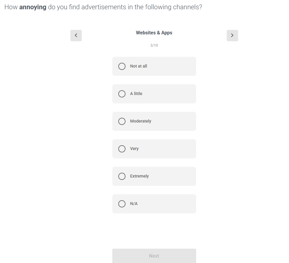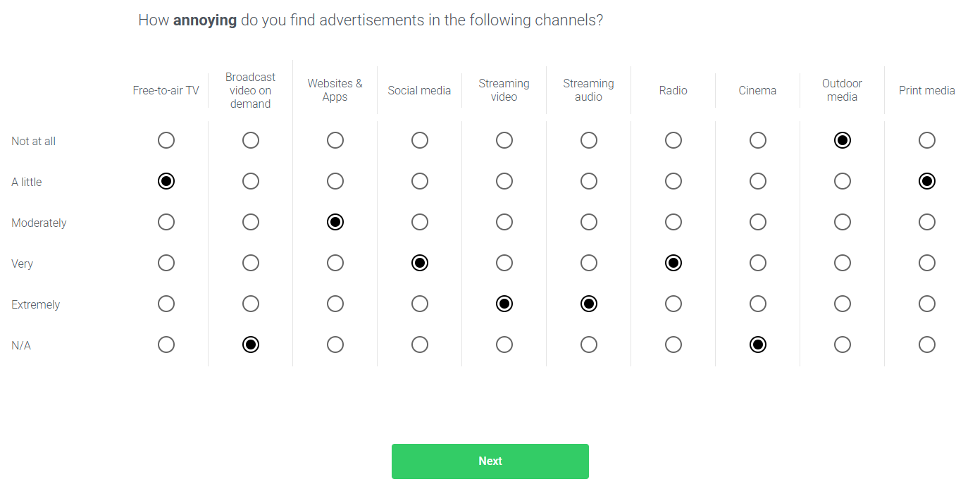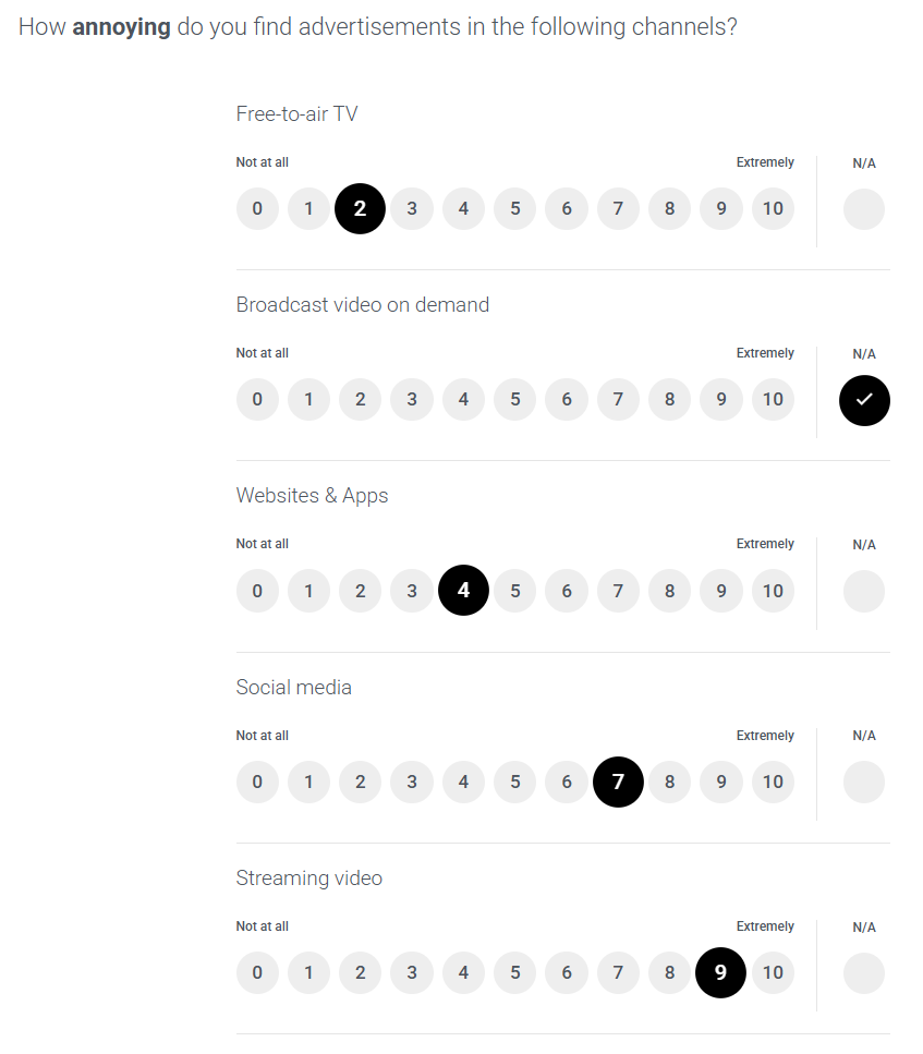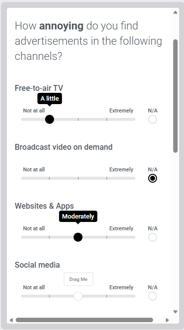 Great for NPS type Matrix questions (e.g. likelihood to recommend).