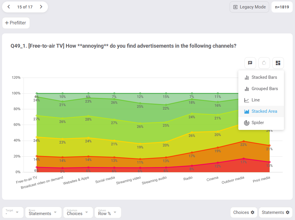 3: Chart Types - All chart types are available for Matrix Questions, whether stacked bars, grouped bars, line, stacked area, or spider charts. E.g. we can change Matrix from Stacked Bars above (default) to a Stacked Area chart below.