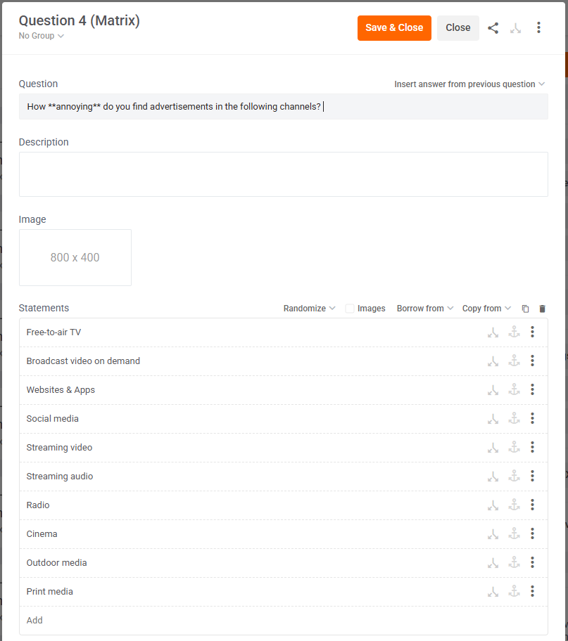- Enter the question, statements, and choices and click 'Save & Close'.