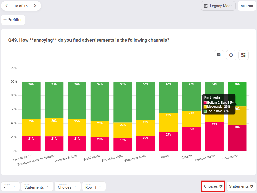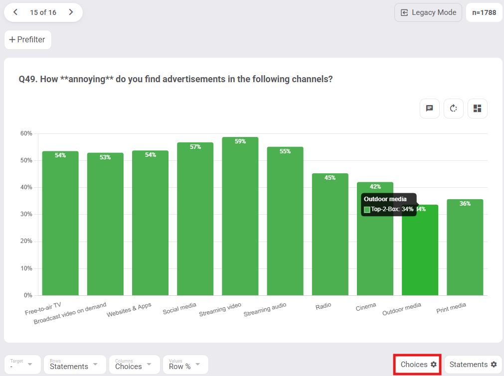 - Chart: Statement in Labels, Choices in Bars & Legend.
