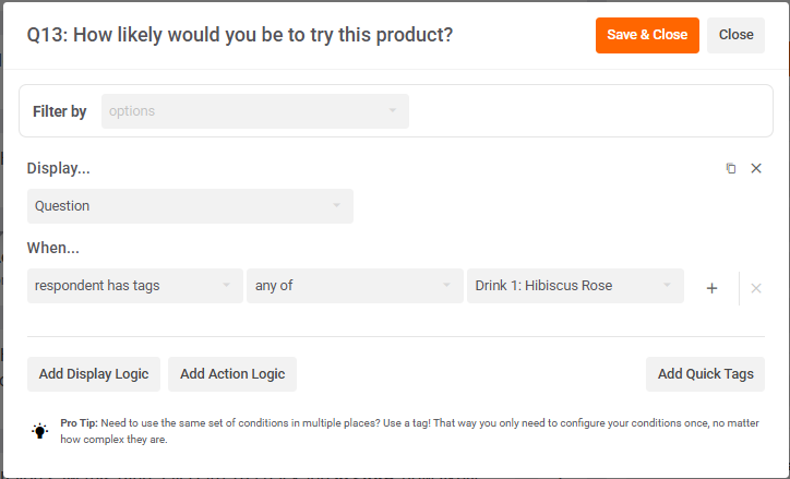 Example: Display... Question; When... respondent has tags any of Drink 1: Hibiscus Rose