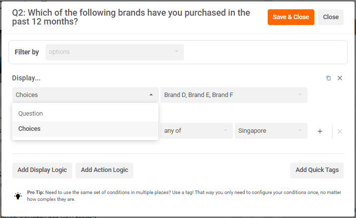 Example: Display... Choices: Brand D, Brand E, Brand F; When... Q1 = Singapore