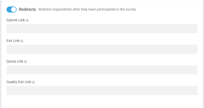 1: Redirects - input your panel partner's redirect links for completes, exits, over quota, and quality exits. You can leave a field blank if it's not available or needed.