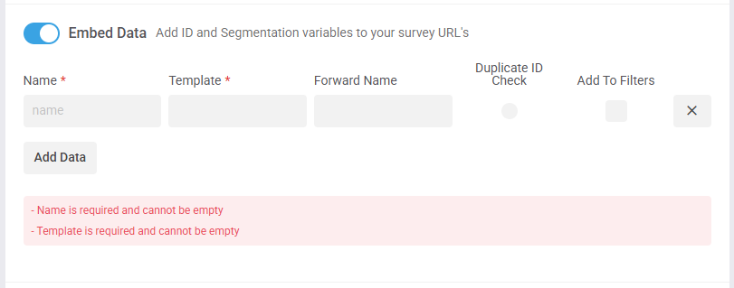 - 'Add Data' allows you to append more variables to your survey link, e.g. age, gender, etc. As many as you need.