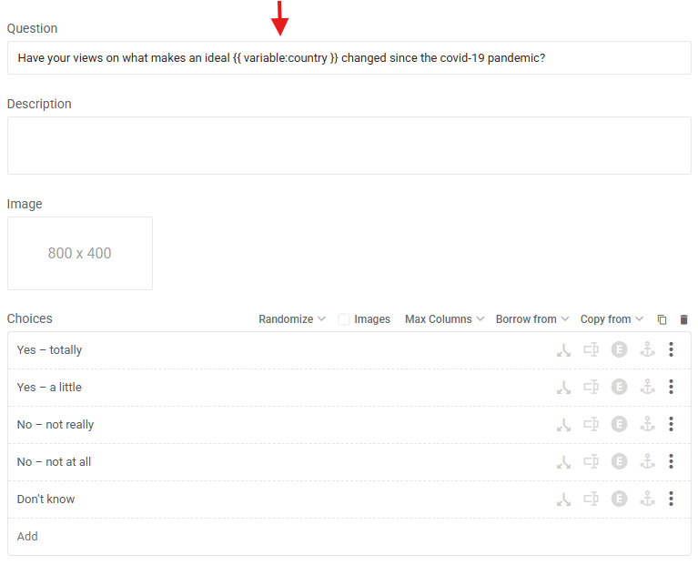 In your question, you can then input {{ variable:country }} wherever needed to inject the correct word into your question
