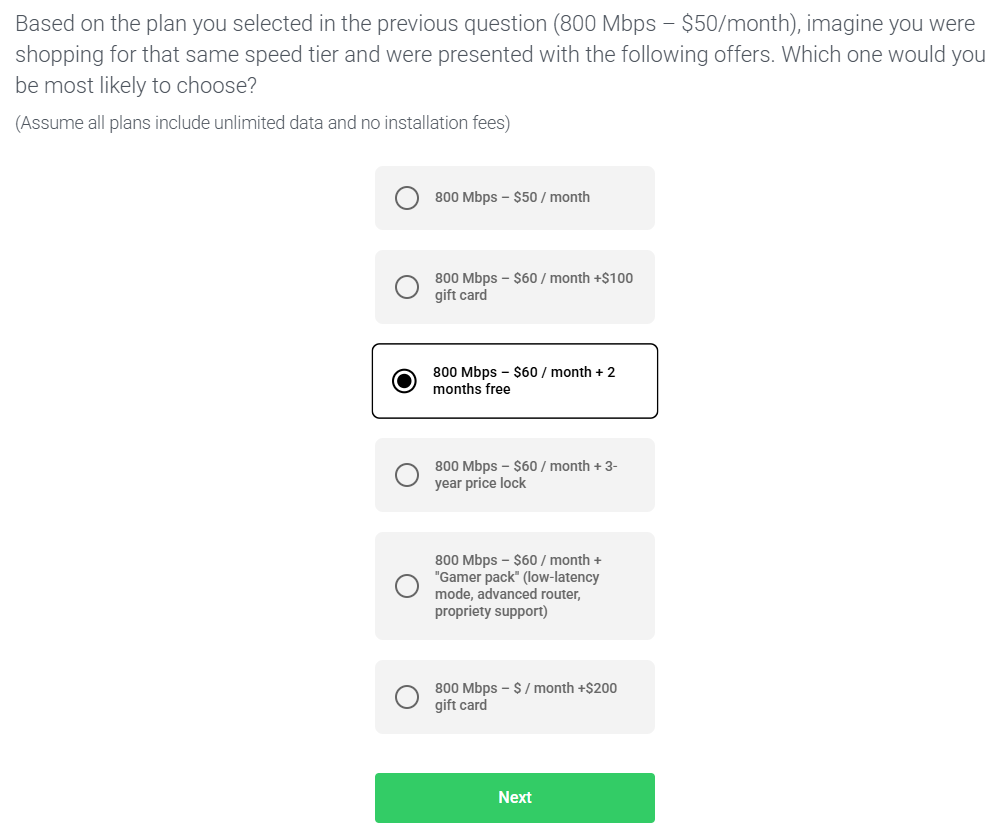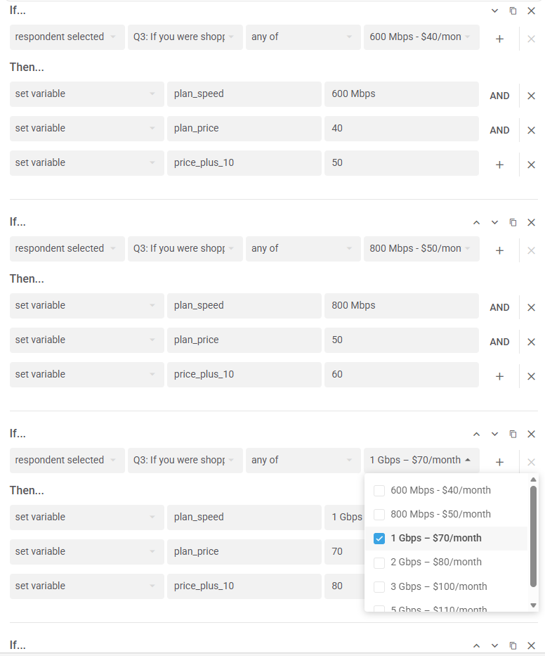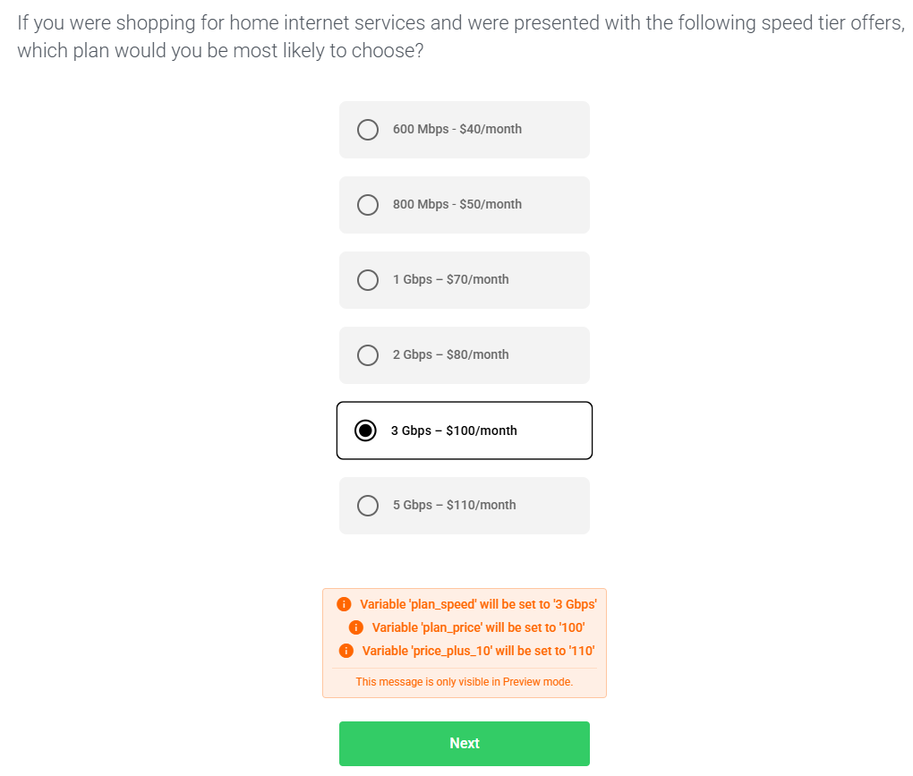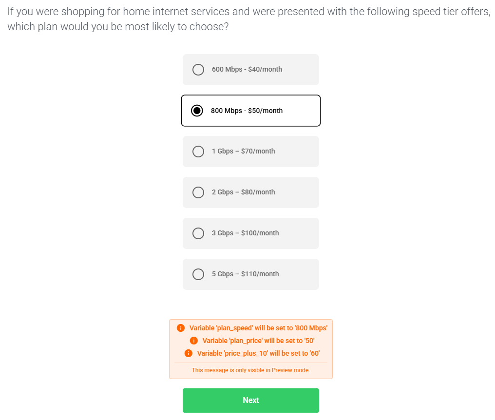 Q1 Preview - if respondent selects 800 Mbps - $50/month at Q1, they are assigned 3 variables: