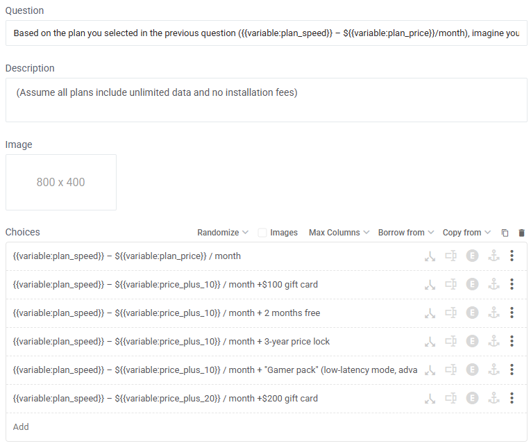 Q2 Editor - in your question editor, input {{ variable:plan_speed }}, {{ variable:plan_price }}, and {{ variable:price_plus_10 }} wherever needed in your question or options.