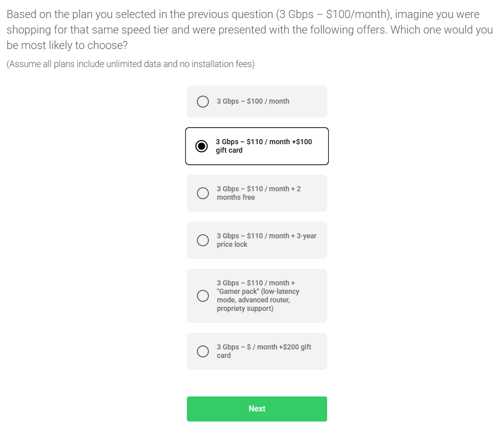 Q2: Competing Internet Plan Offers - so sees the corresponding speed (3 Gbps), price ($100/month), & price+10 ($110/month) variables at Q2.
