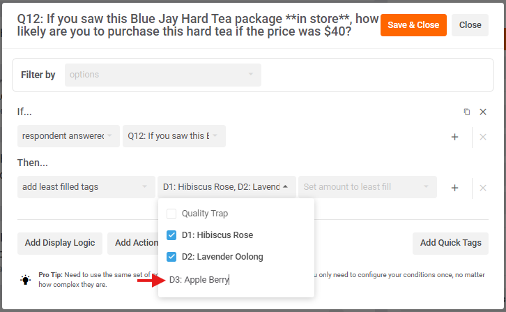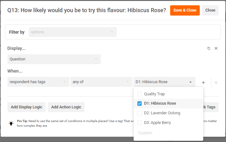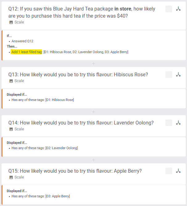 Least Filled Tags is typically used in combination with Display Logic as you want to display questions or options depending on which Tag respondents were allocated. E.g. display Q13 if respondent has tags - D1: Hibiscus Rose