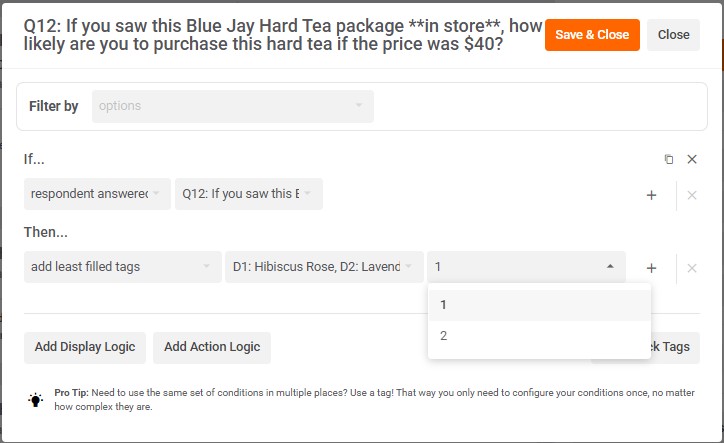 Least Filled Tags is a powerful and popular tool that allows you to distribute your respondents equally across each of your tags or concepts. This is perfect for Concept Testing or Ad Pre-Testing use cases. It’s simple to use once you see how it works below.