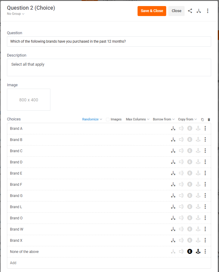 - In the 'If...' dropdown, input your condition, i.e. if respondent has tags > any of > Brand A, Brand B, Brand C, Brand D, Brand E, Brand F, Brand G, Brand L, Brand O, Brand W, Brand X.