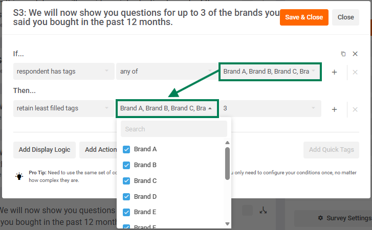 Use 'retain least filled tags' when respondents have all of the tags needed, but you only want the respondent to retain a portion of the tags that they've qualified for and remove the rest of the tags.