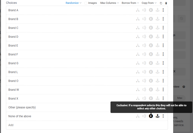 Click the 'E' button next to your choice to make it exclusive. If a respondent selects an exclusive choice, this will deselect every other choice and select only that choice. This is perfect for choices like "None of the above" and is available in Choice, Rank, and Matrix question types, i.e. wherever respondents can select multiple choices.