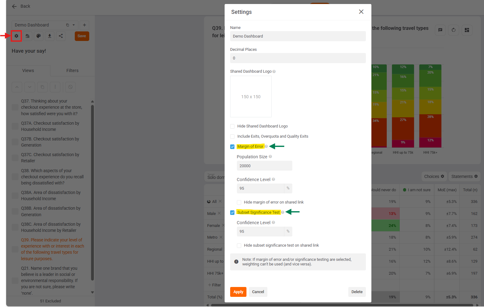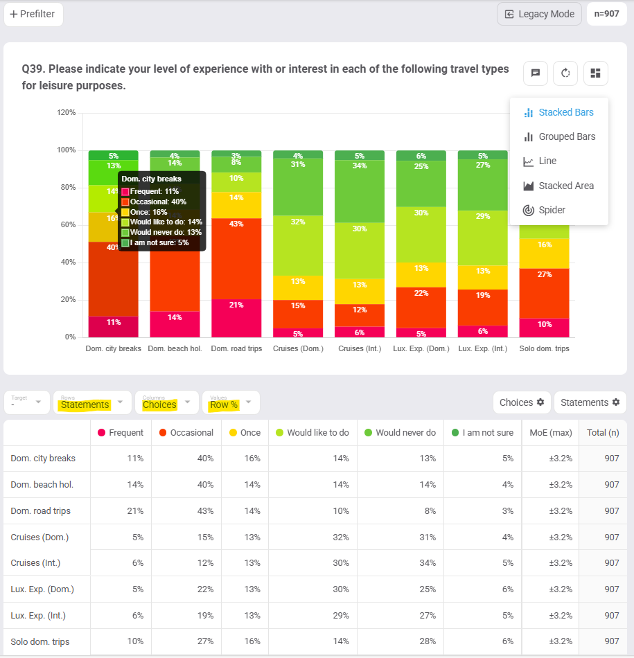 You can also tick "Margin of Error" to see how statistically robust each of your row's sample sizes are (e.g. +/-3.2% moe for n=907 sample).