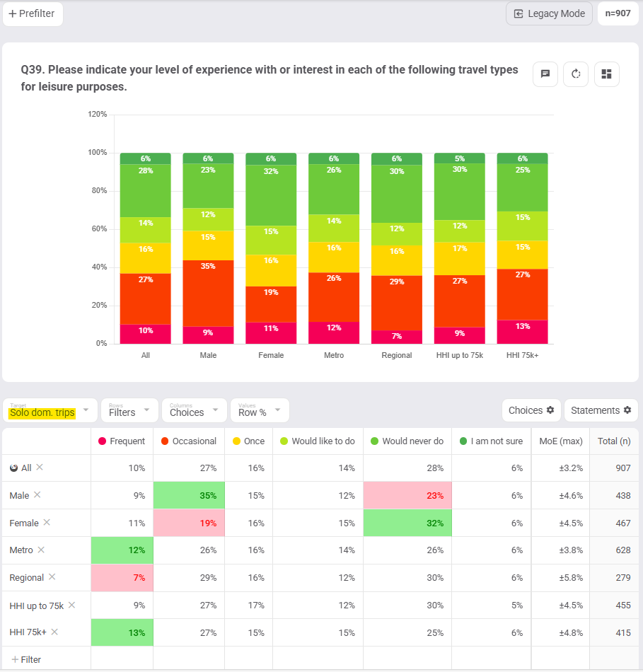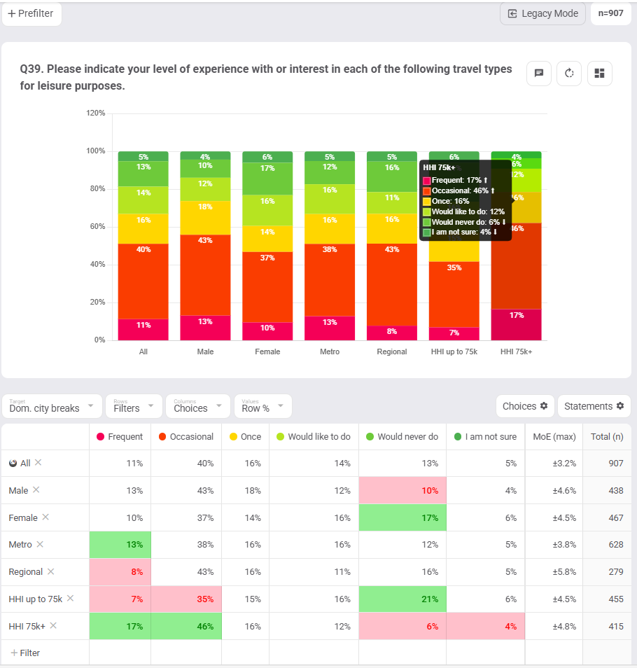 You can now compare your filters e.g. for All, Gender, Region, and HHI side by side and see differences between them for the "Domestic city breaks" statement. 🥳 E.g.