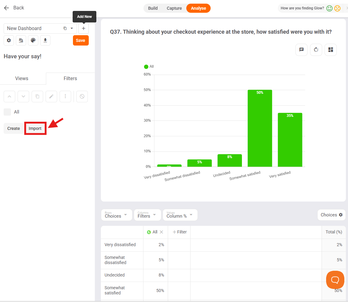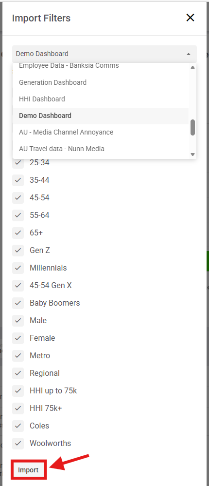 If you have multiple dashboards in the same survey (either by duplicating an existing dashboard or creating a new one), you can import filters from any other dashboard to your current dashboard which saves you heaps of time not needing to recreate filters you've already created elsewhere! To import: