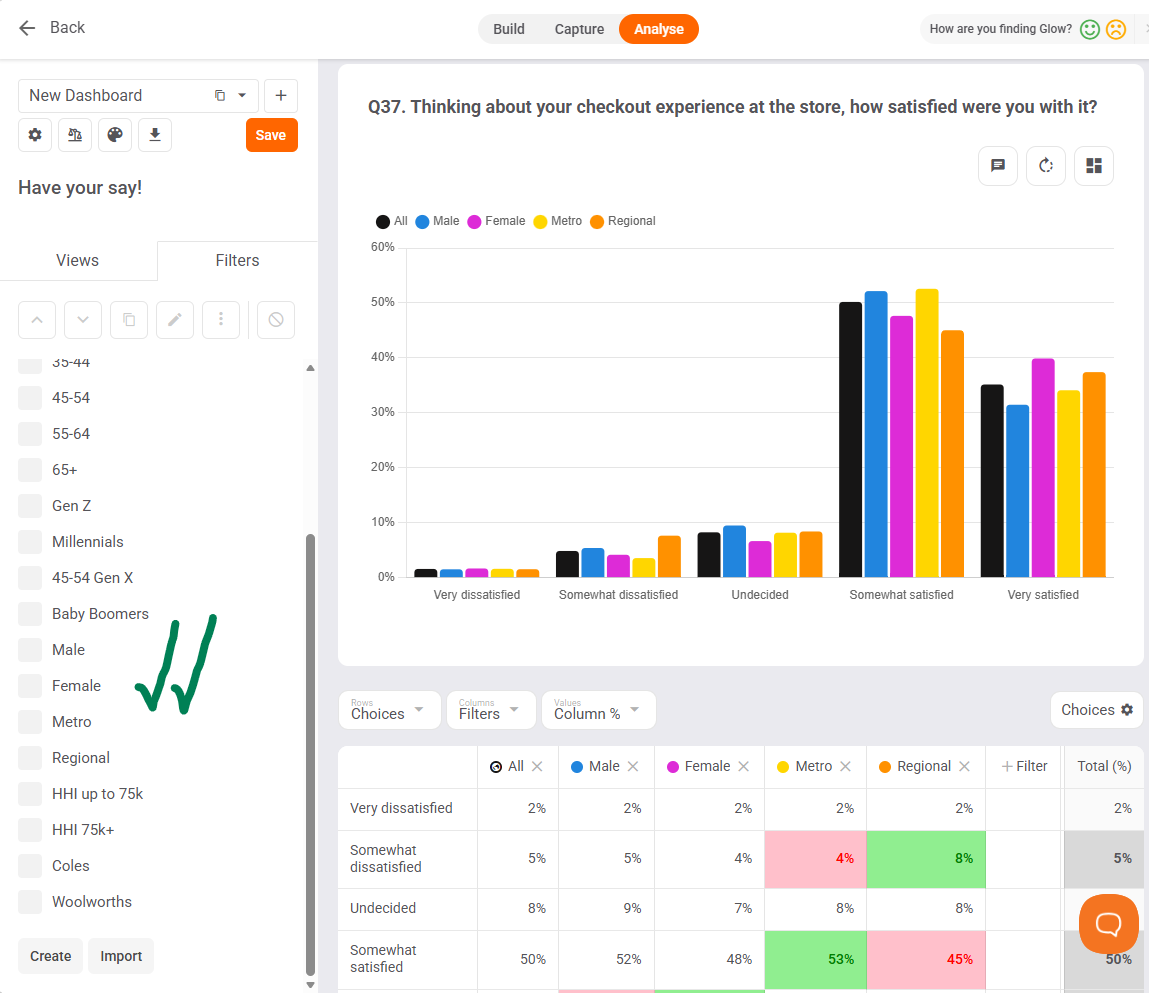 Filters let you segment your audience, e.g. across gender, age, time, country, personas, brands, segments (you name it!) so you can instantly slice & dice your questions, see differences across groups, create sig-tested, visualised crosstabs & time series, and even code & chart text questions using filters!