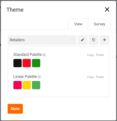 To change the colour theme across all views in your dashboard, switch to the "Survey" tab in your Theme menu. To change the colour theme at the individual view level, make sure you're in the "View" tab. The View Theme will always supersede the Survey Theme.