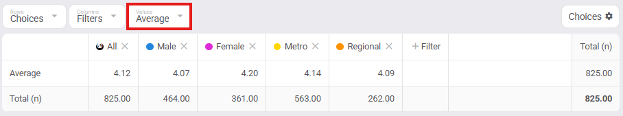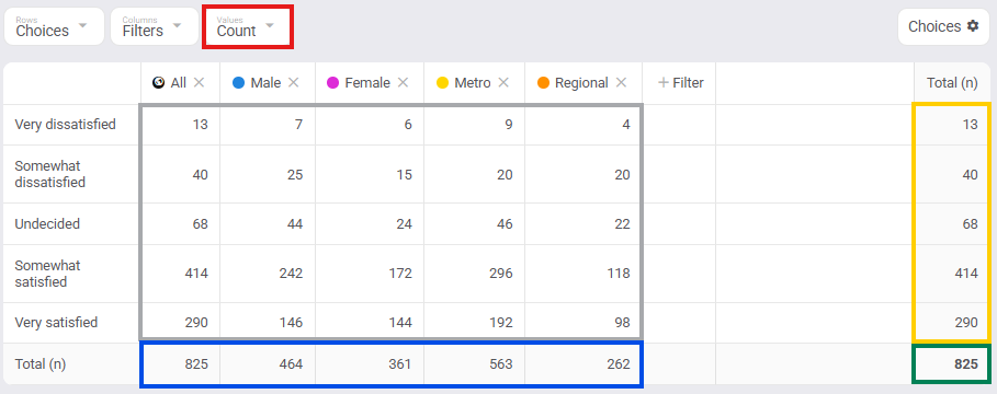 Total Total (green bottom-right cell) is how many respondents answered any row variable in any column variable (i.e. the intersection of rows and columns). E.g. n=825 answered any choice in the rows and qualified for any filter in the columns.
