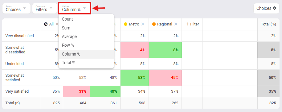 Column % is Count / Column Total, e.g. 242 / 464 = 52% of Males were "Somewhat satisfied" with their checkout experience. This is the default value for Choice questions