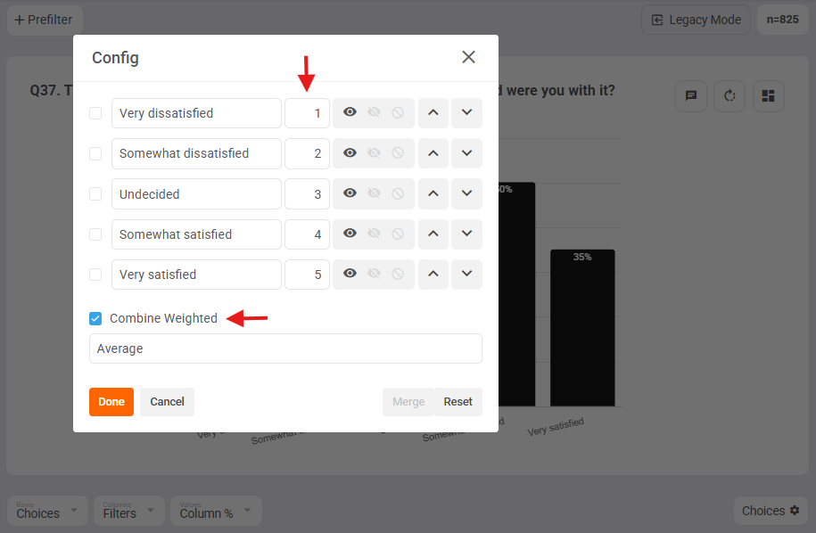- tick Combine Weighted and give your combined variable a name, e.g. "Average" or "NPS" or "Freq. p/year"