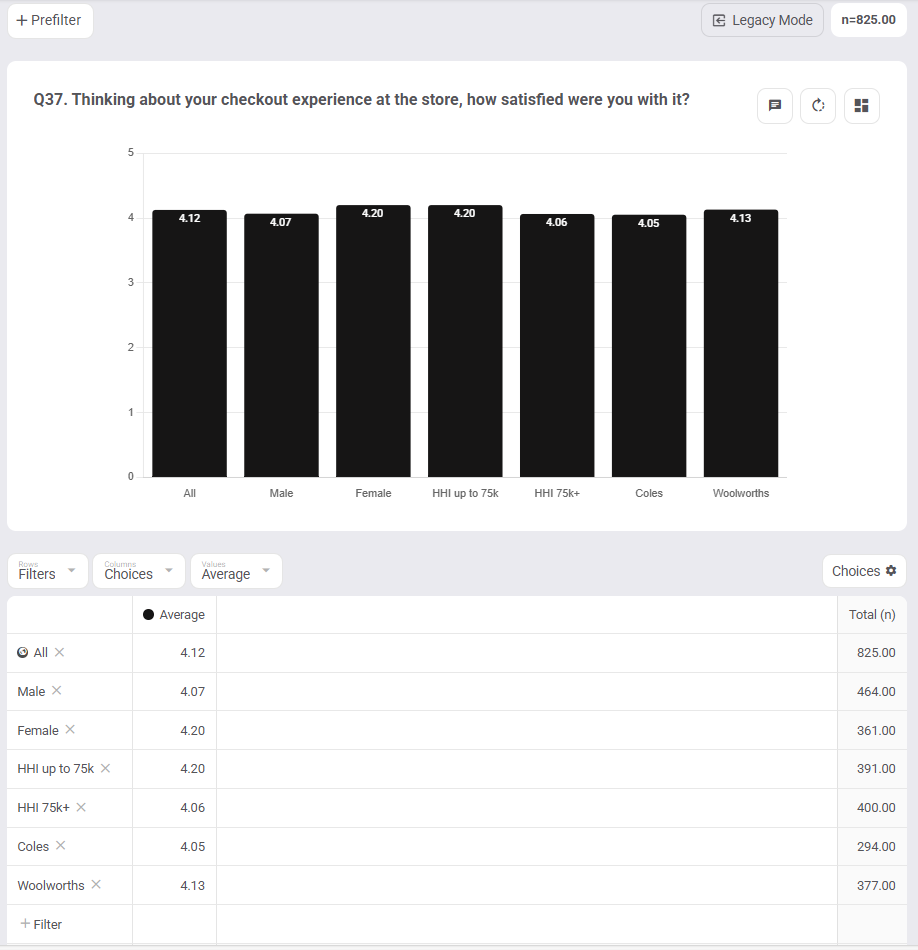 Your cross filters will be added to your chart & table so you can compare averages side by side and see differences between groups, e.g. average checkout satisfaction of 4.07 out of 5 for Male vs. 4.20 for Female.
