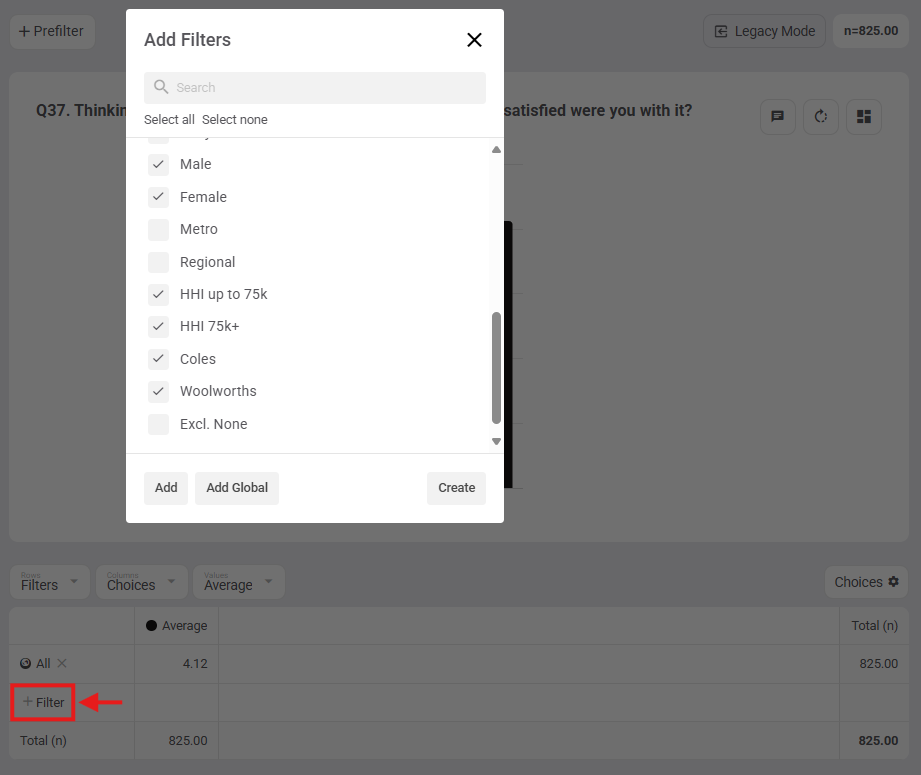 - select the filters you want to add, e.g. 2 gender, 2 HHI, and 2 retailer filters.