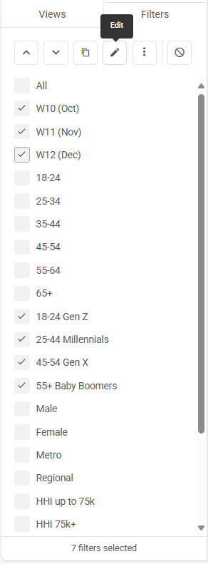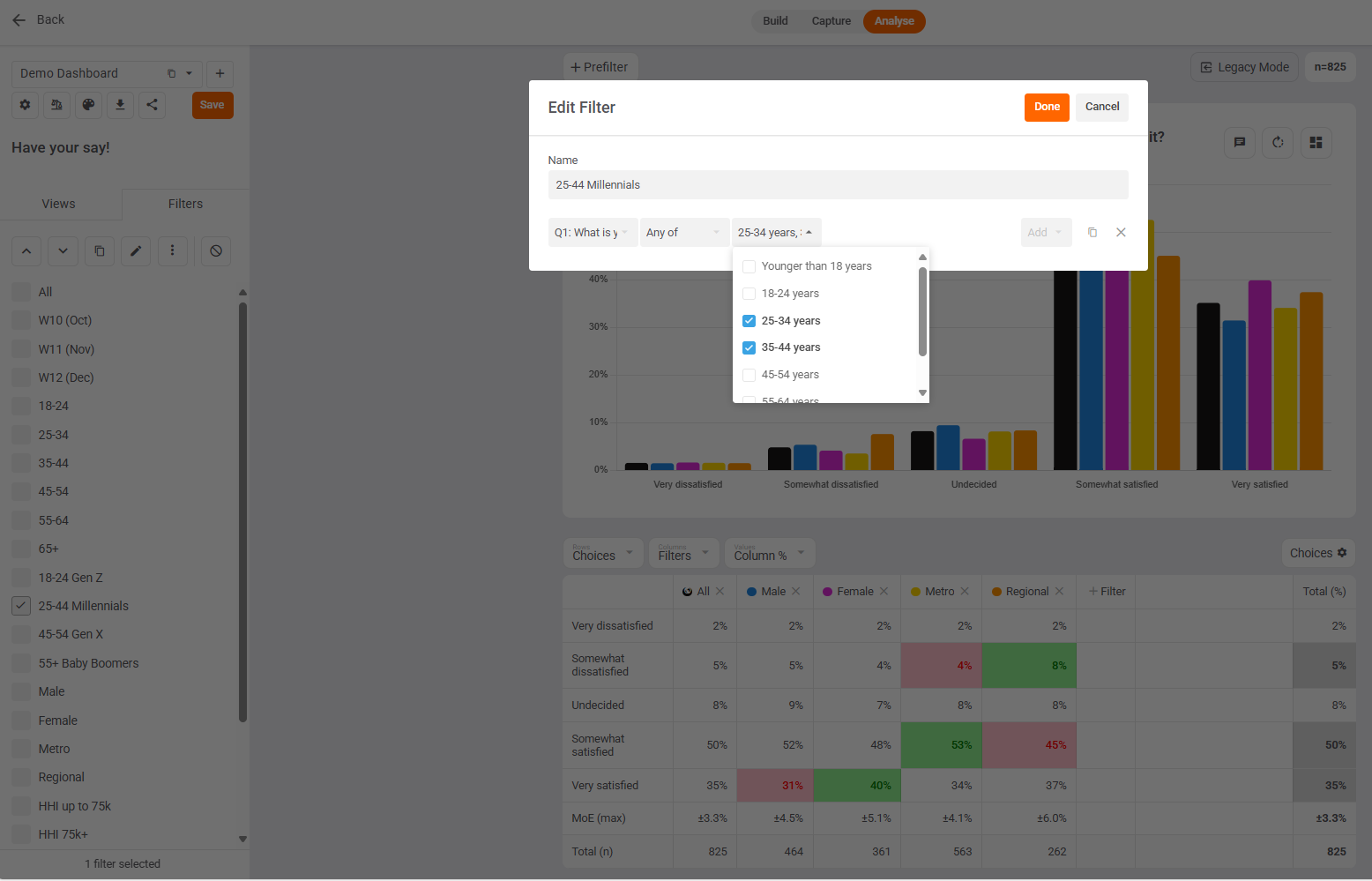 Filters are easy to create using any combination of Any of, All of, None of, Exactly, as well as AND and OR logic. E.g. here's a simple Filter for "25-44 Millennials" = Any of 25-34, 35-44 years old.