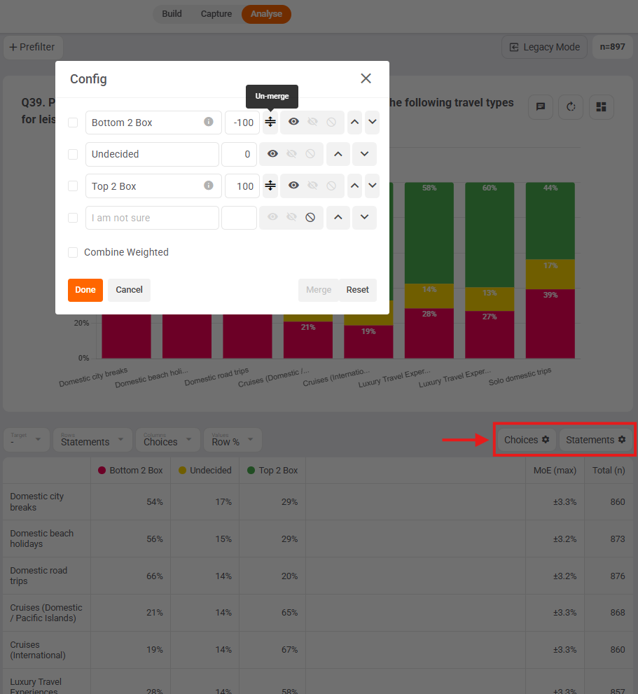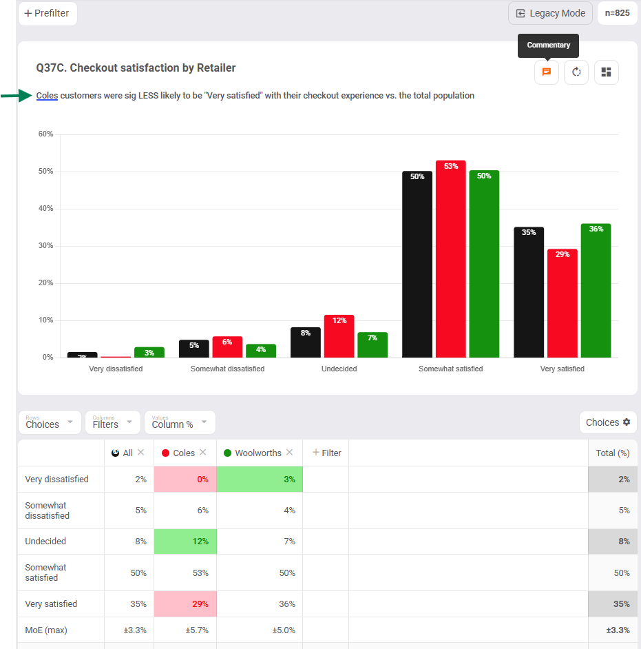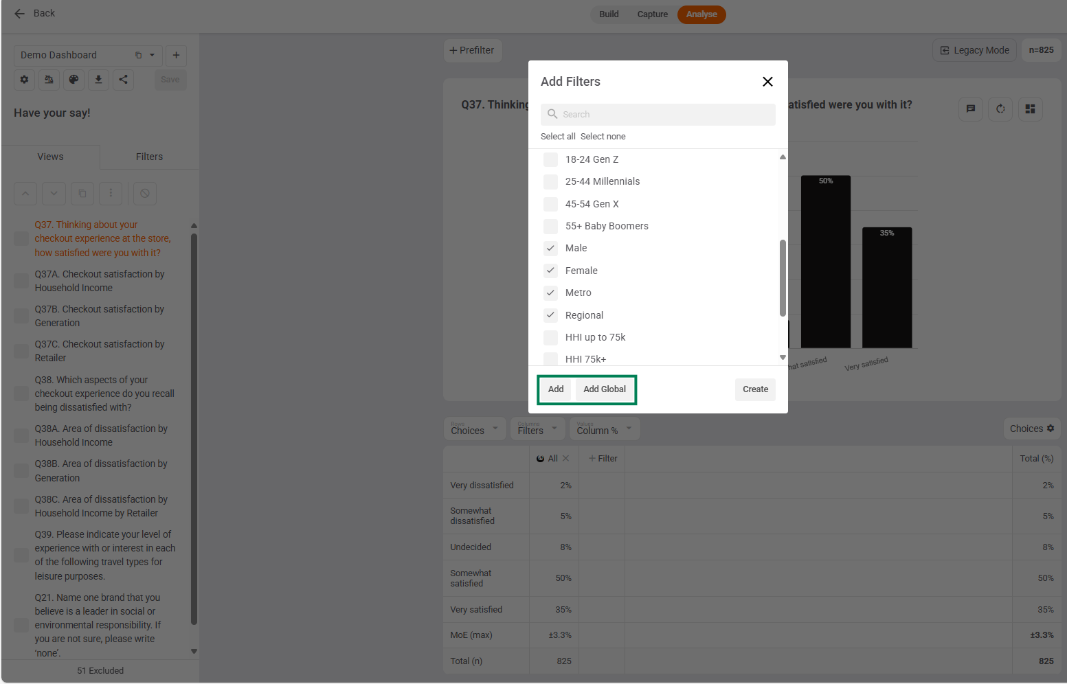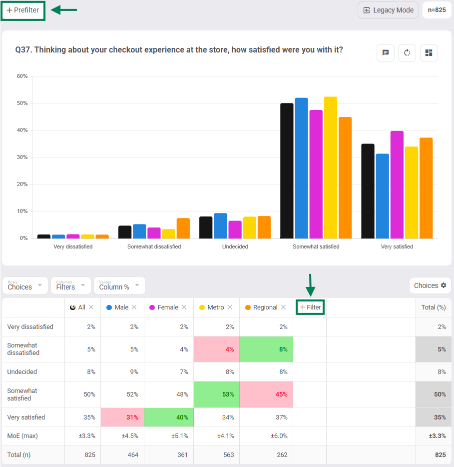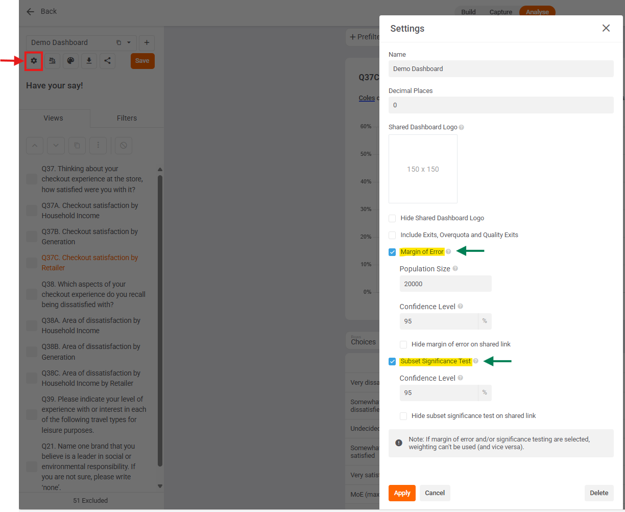 Sig-Test & Margin of Error: Conduct sig-testing by going into your dashboard settings, then tick "Subset Significance Test" and click "Apply" to highlight statistical differences. Cells that are significantly higher or lower than the total will appear as green and red cells in table / up and down arrows in chart. You can also tick "Margin of Error" to see how statistically reliable your sample sizes are in your tables. Both statistical tests are set to 95% confidence level by default.