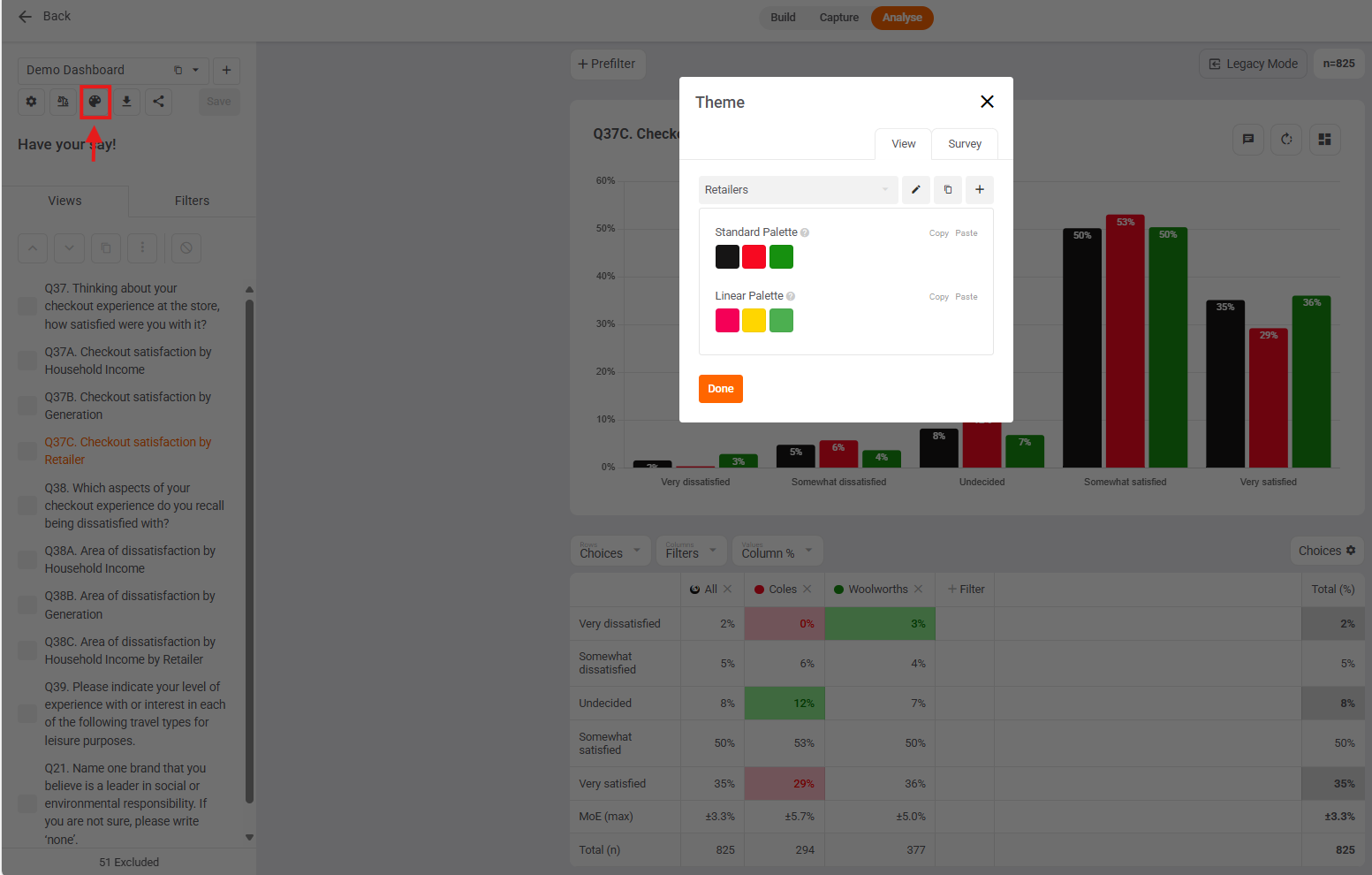 View Theme: Edit your chart colours to match your brand or theme. E.g. Woolworths green, Coles red, and All black.