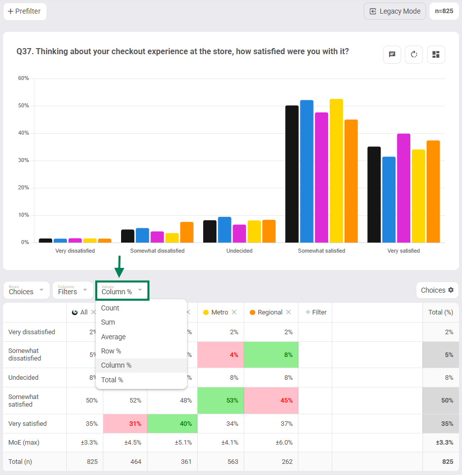 Values let you see your counts, percentages, sums, and averages for your question. Here, Column % is used because our filters are in the columns. Tip: if Filters in columns use Column %, but if Filters in rows use Row %.
