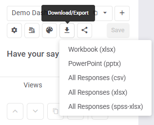- Export responses to csv (text), xlsx or spss-xlsx (numeric).