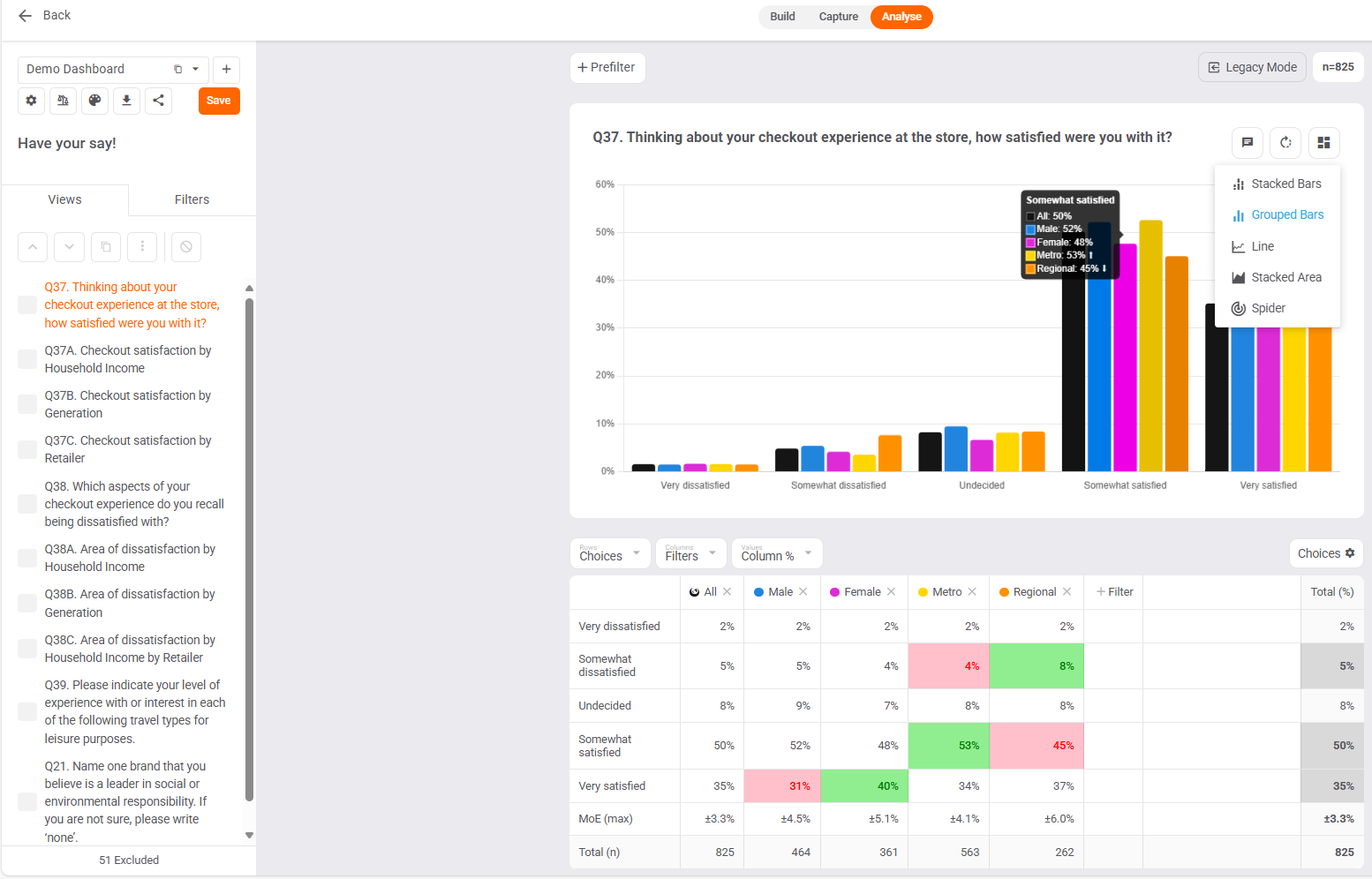 AV2 is a powerful analysis dashboard that lets you instantly create sig-tested or weighted charted crosstabs & time series for choice, matrix, rank, constant sum, and looped questions across all your audience filters in stacked / grouped bar, line, area, or spider charts (and word clouds for text questions) in shareable dashboards.