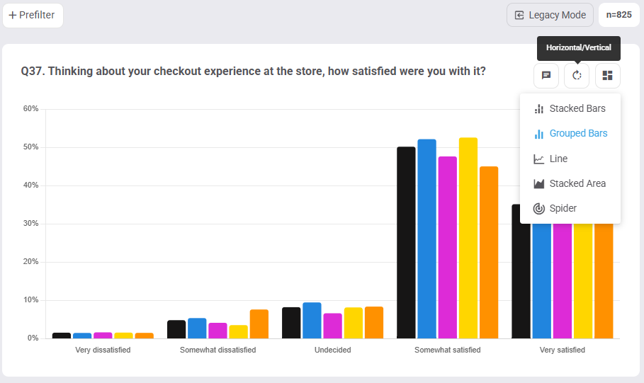 Chart Types: pick between Stacked Bars, Grouped Bars, Line, Stacked Area, and Spider charts and rotate bar charts between Horizontal (default) or Vertical views.