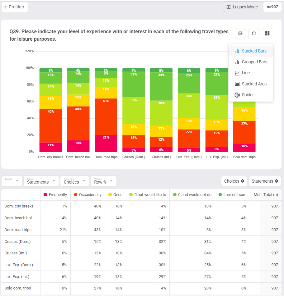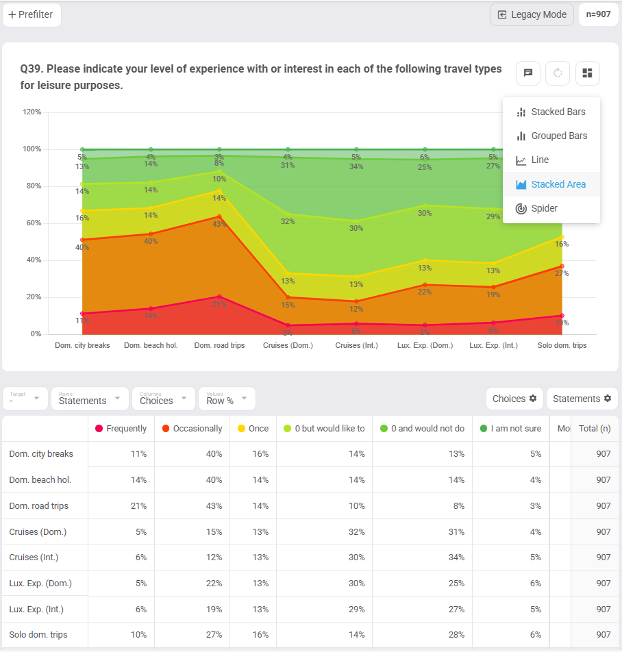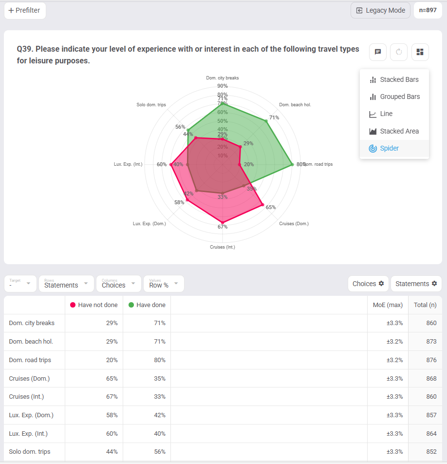 Chart Types: Stacked Bars, Grouped Bars, Line, Stacked Area, Spider.