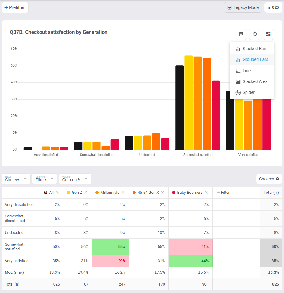 Because bars are grouped next to each other, it's easier to visually see differences and compare data side by side. Perfect for when your Filters are in the table Columns and Values is set to Column %