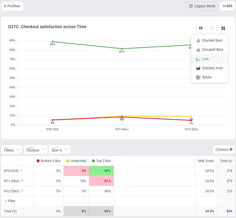 Because bars are stacked on top of each other, it's easier to visually sum them together. Great for when Choices are in the table Columns and Values is set to Row %