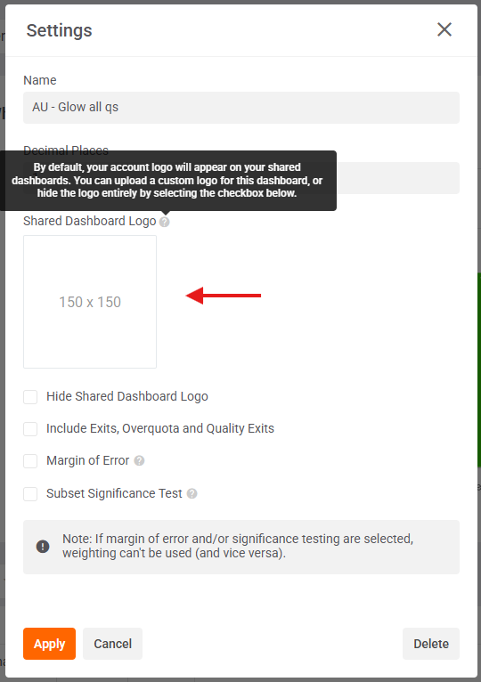 Your account logo (e.g. your brand logo) will appear at the top left of all shared dashboard by default, but you can change this to a custom logo specific only to that dashboard (e.g. your client's logo) in your dashboard's settings. Alternatively, you can hide the logo entirely by ticking the "Hide Shared Dashboard Logo" checkbox.