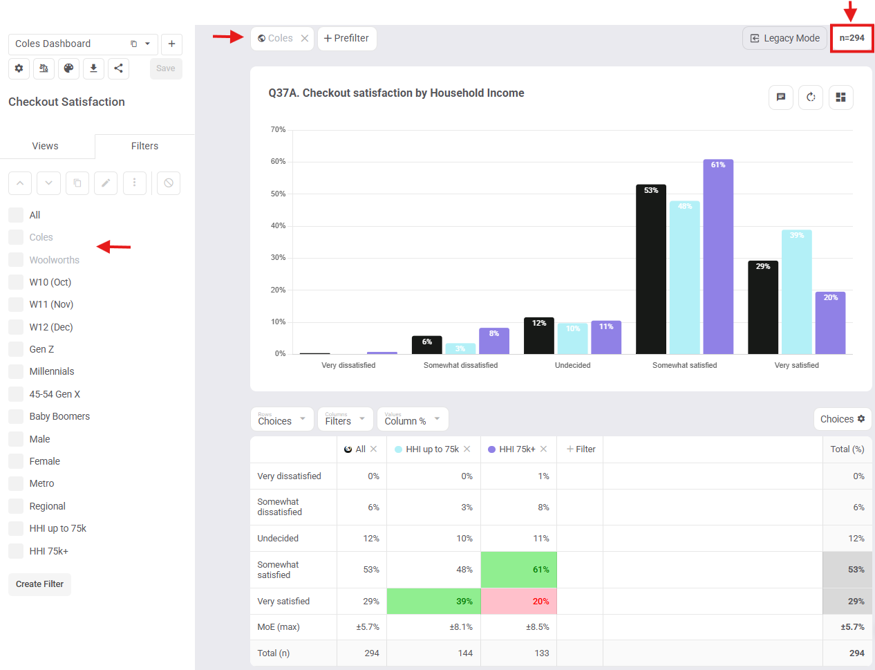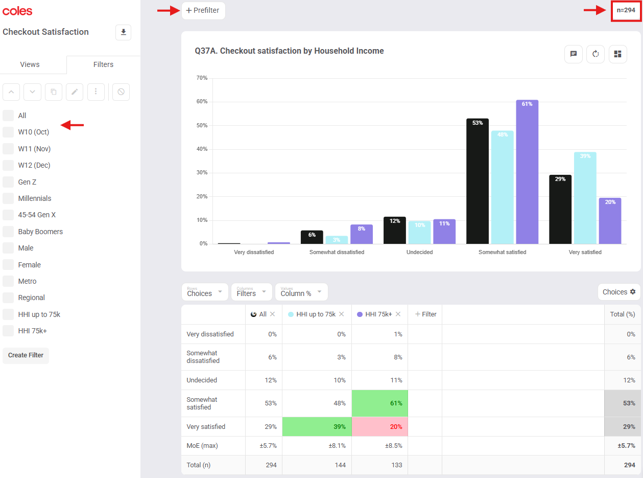 Shared Dashboard: Coles Prefilter Applied but Invisible (same base of n=294)