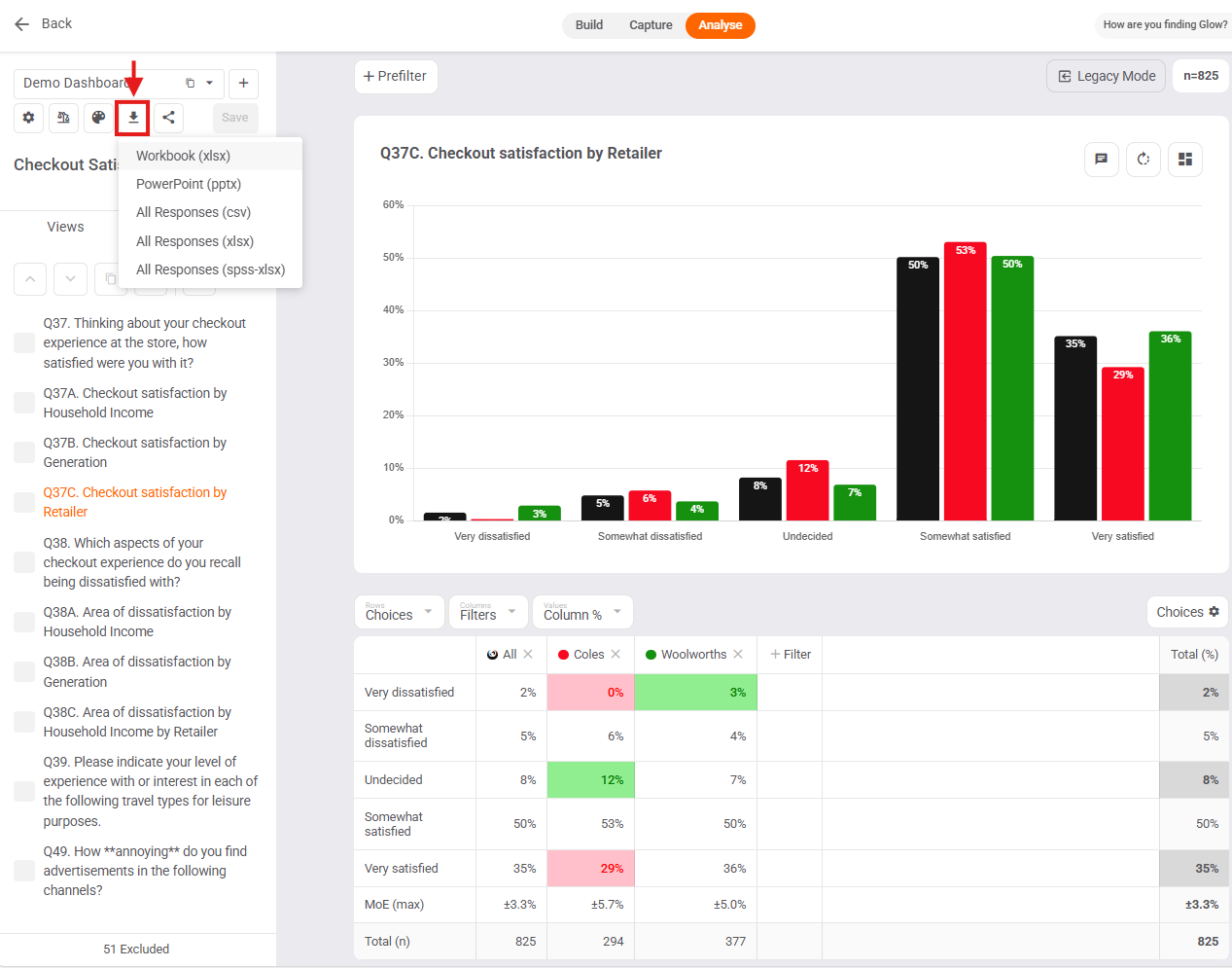 Just click the download button in your dashboard bar (top left) and click Workbook (xlsx) for the Tables and PowerPoint (pptx) for the Charts.