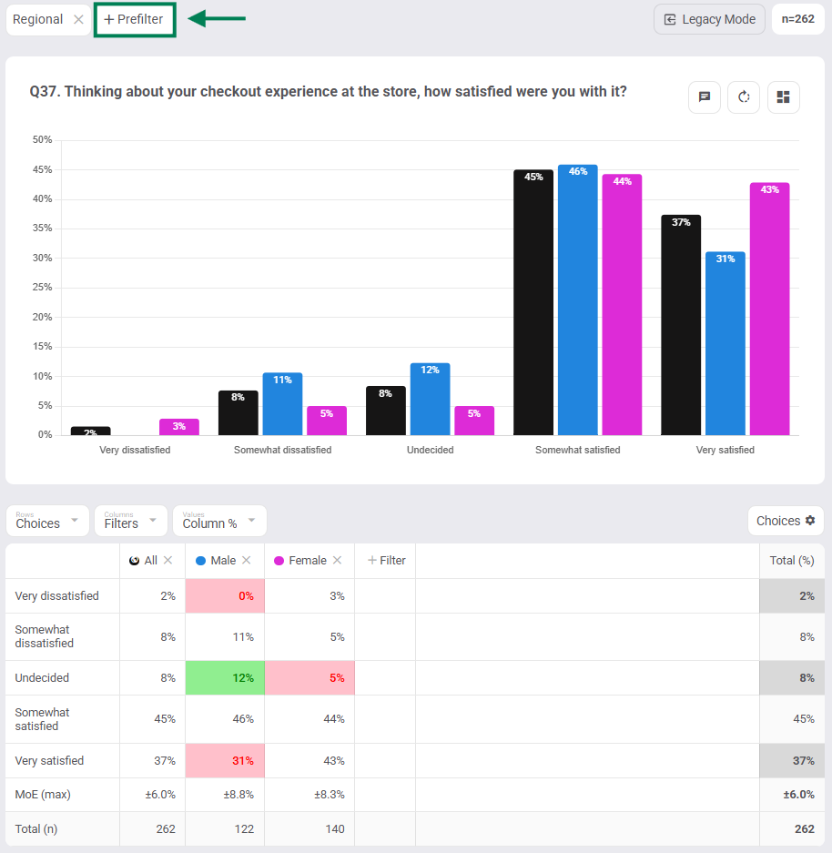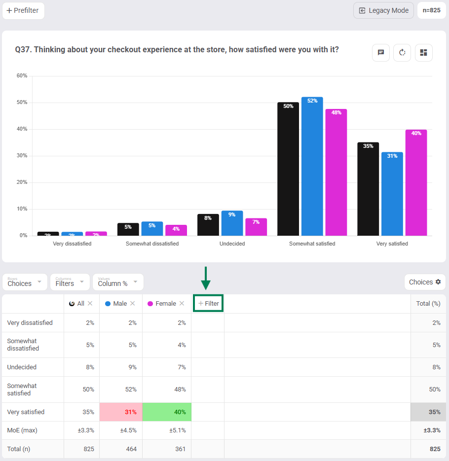 - Click +Filter in your table columns or rows to cut your data by your filters for easy side-by-side comparison across groups (visualised crosstabs).