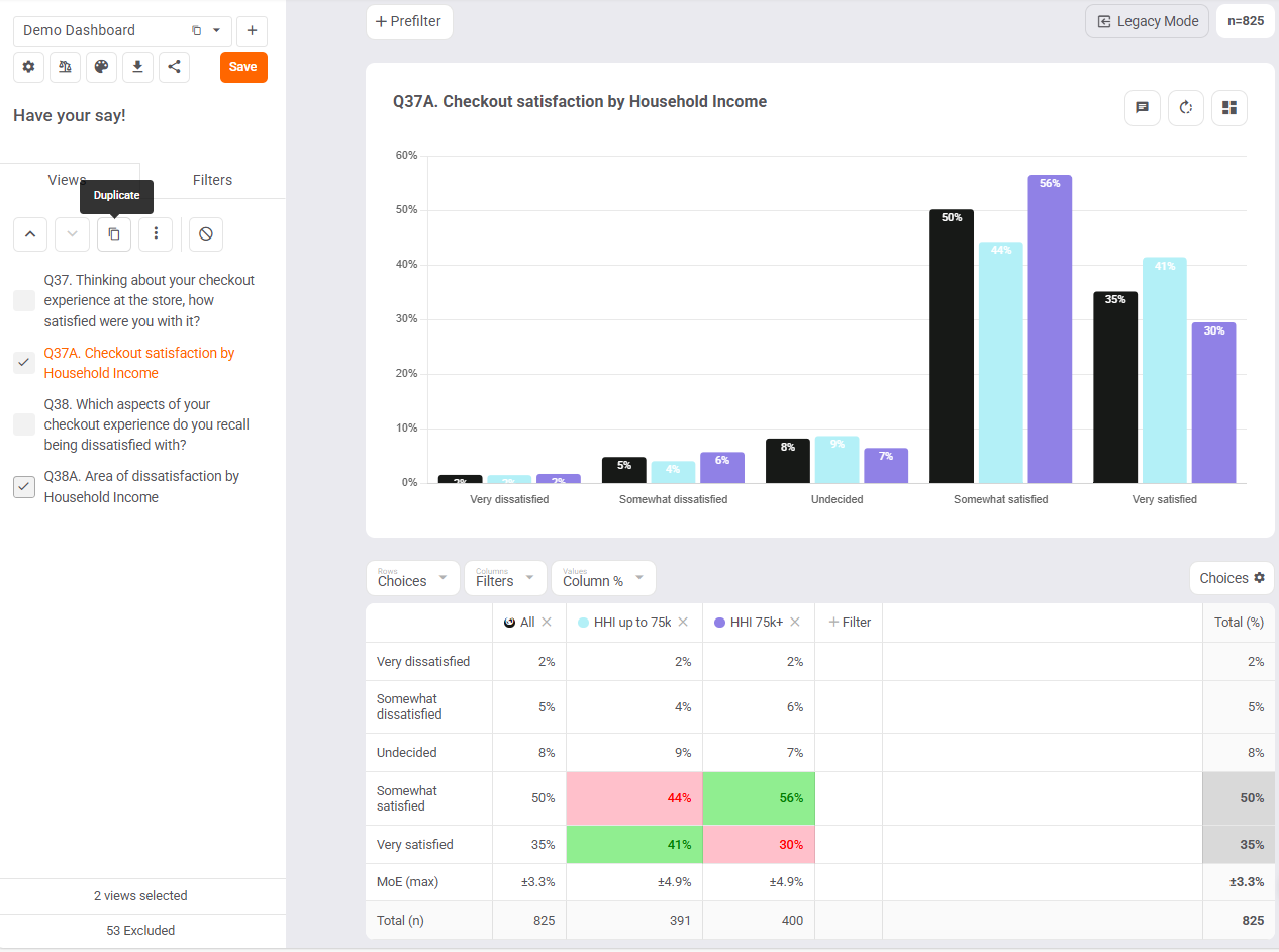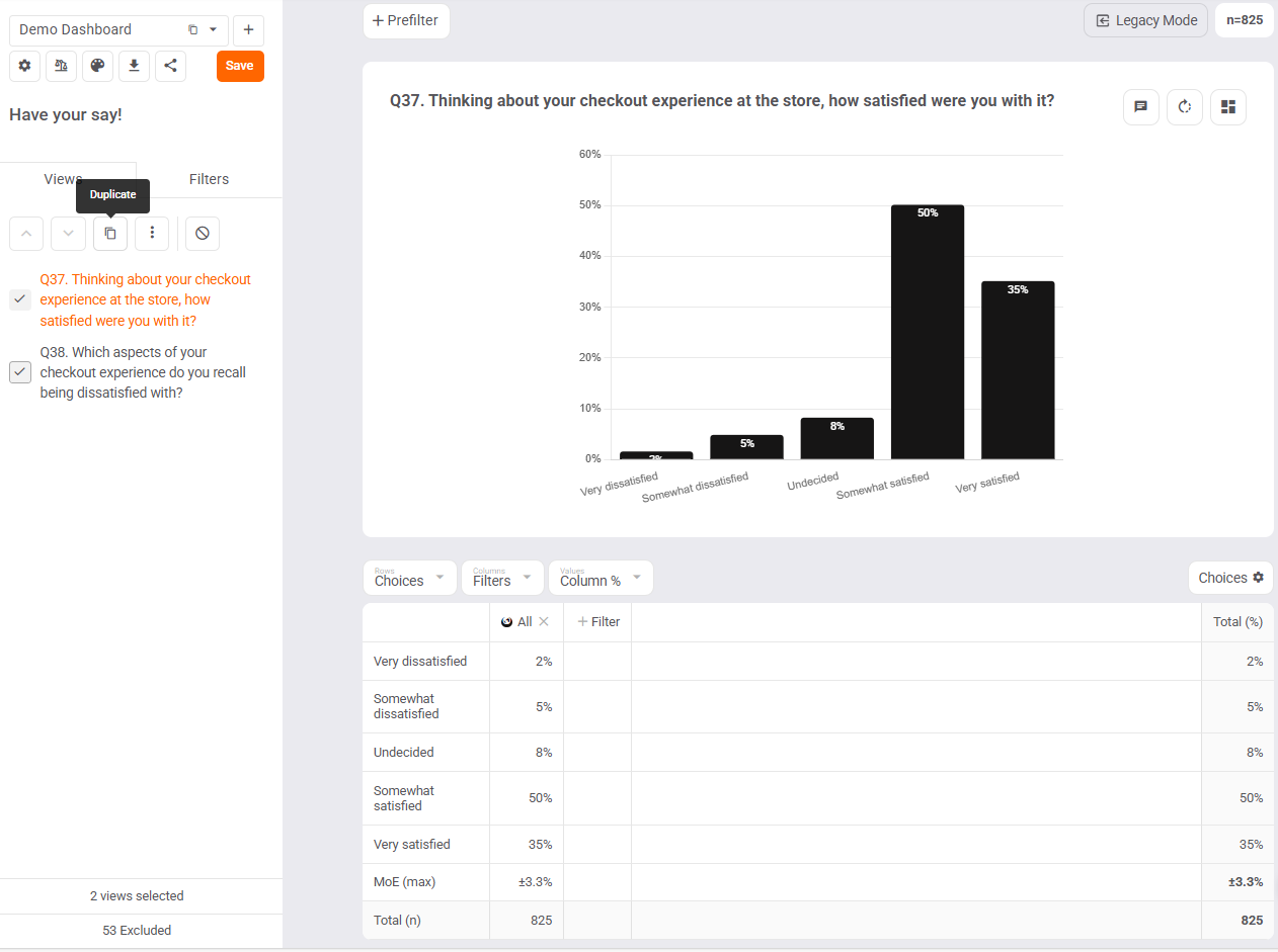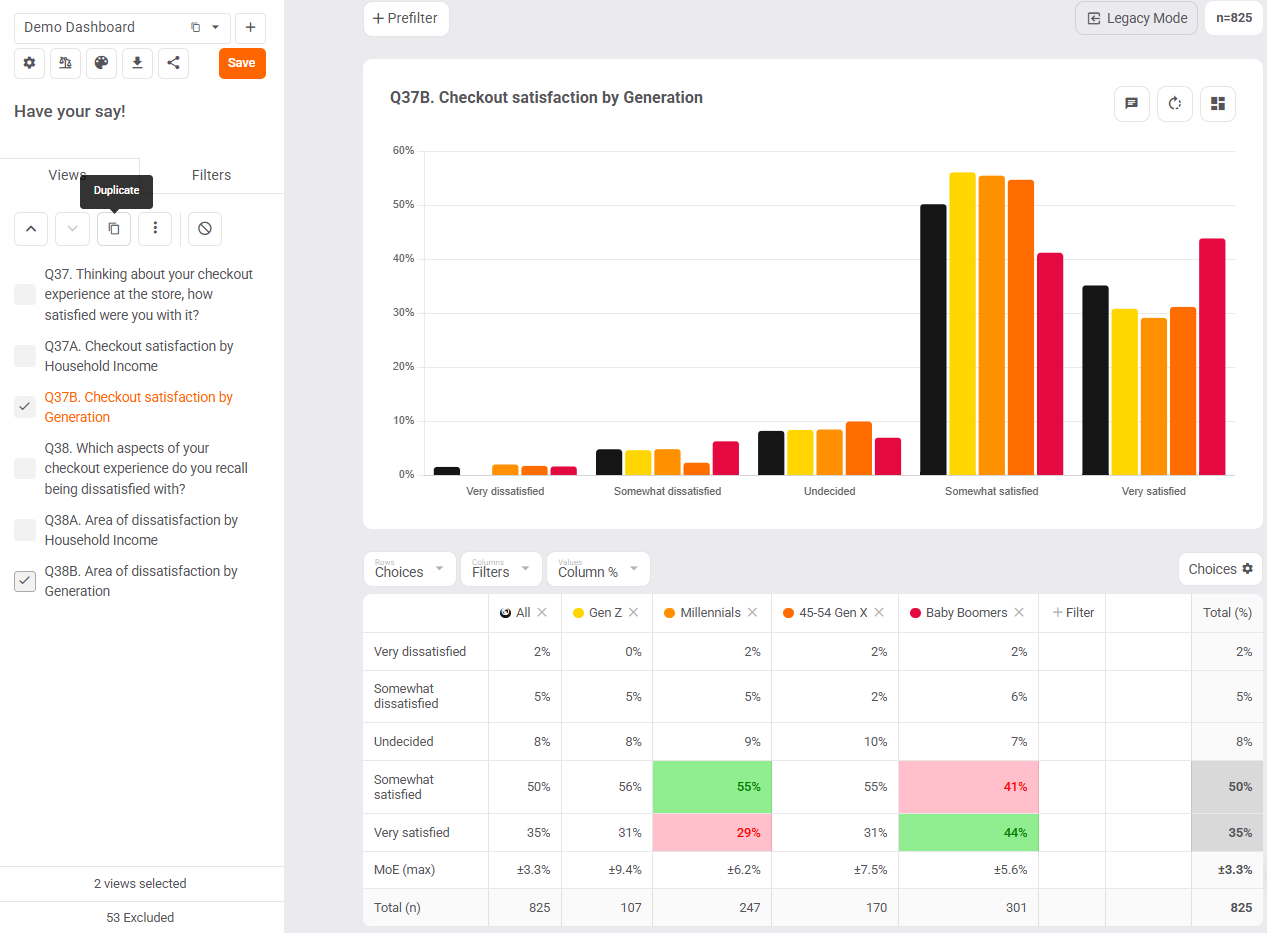 3: Duplicate selected views to tell a multi-facetted story for each question. Simply select the views you want to duplicate and click the duplicate icon. E.g. you could have: