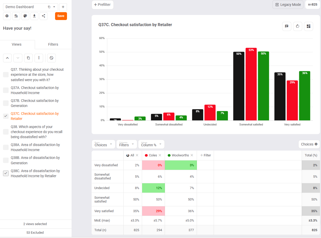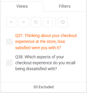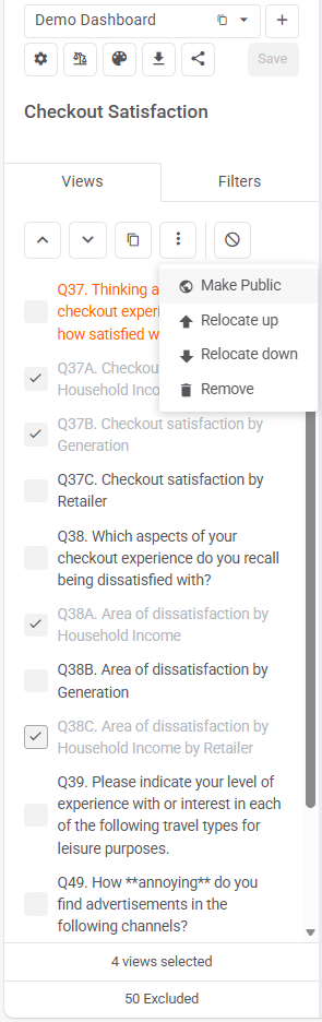 2: Remove selected views to strip your dashboard down to just the essential views. Just select all the views you want to remove, click the 3-dot icon, and click 'Remove'. You can see how many views you've removed in the 'Excluded' tab at the bottom of the 'Views' tab. E.g. in the below dashboard, we've removed 53 questions (Q1-Q36 and Q39-Q55) and left just 2 questions (Q37 and Q38).