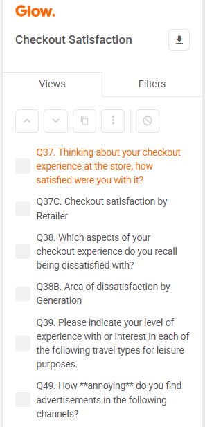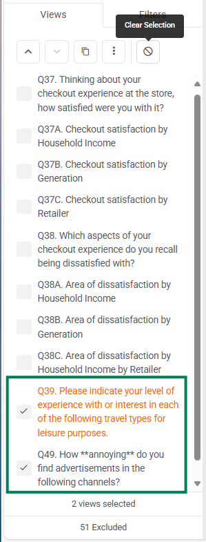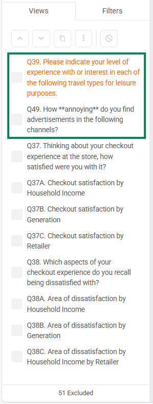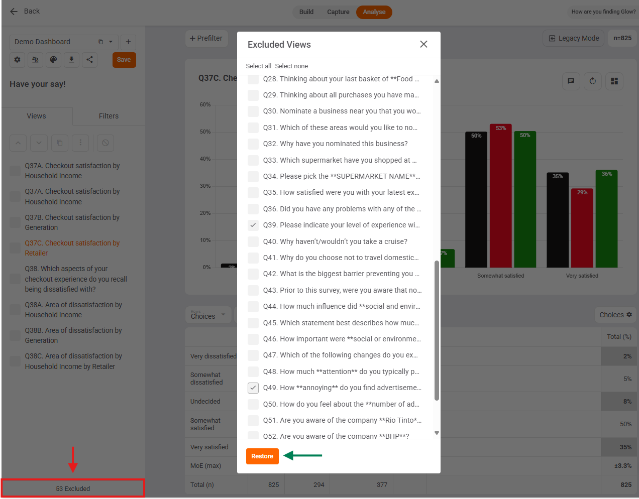 5: Restore Excluded views - views you've completely removed from your dashboard can be restored within the 'Excluded' tab at the bottom of the 'Views' tab. Simply select the views you want to restore and click Restore. E.g. let's restore Q39 and Q49.