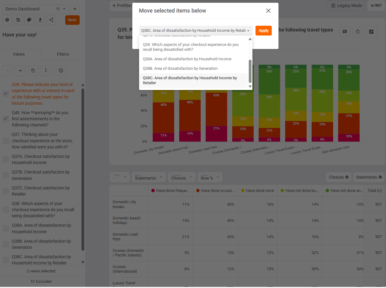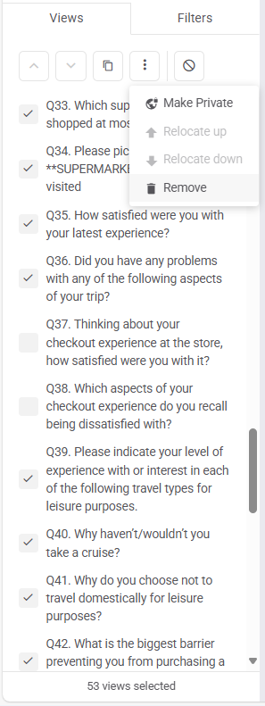 6: Move or Relocate selected views to anywhere you like in your survey. Simply select the views you want to move, click the 3-dot icon and click 'Relocate down'. Then select the question you want to move them below and click 'Apply'. E.g. let's move our restored views (Q39 and Q49) from the top of our dashboard to the bottom (below Q38C).