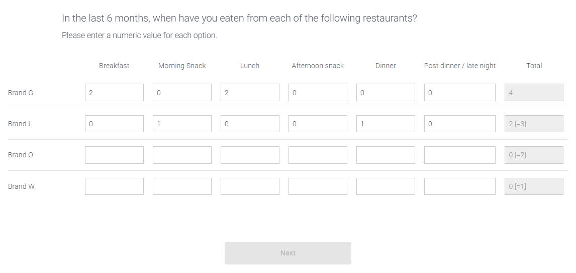 - If Brand G = 4 at Q2, Total must equal 4 for Brand G at Q3.