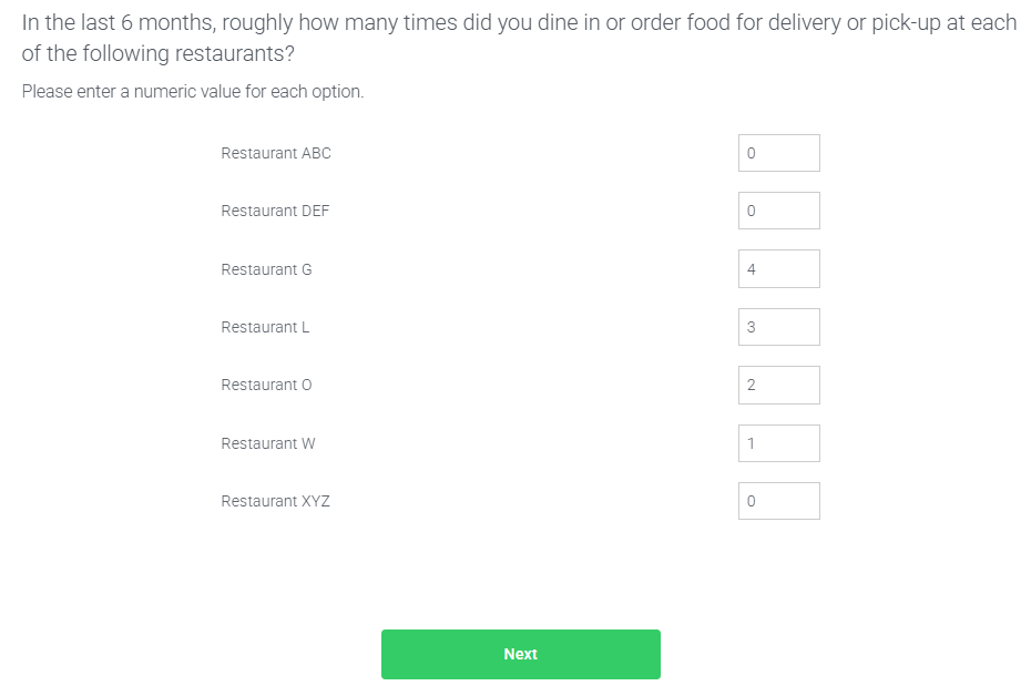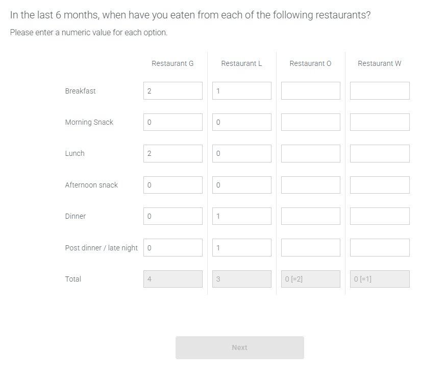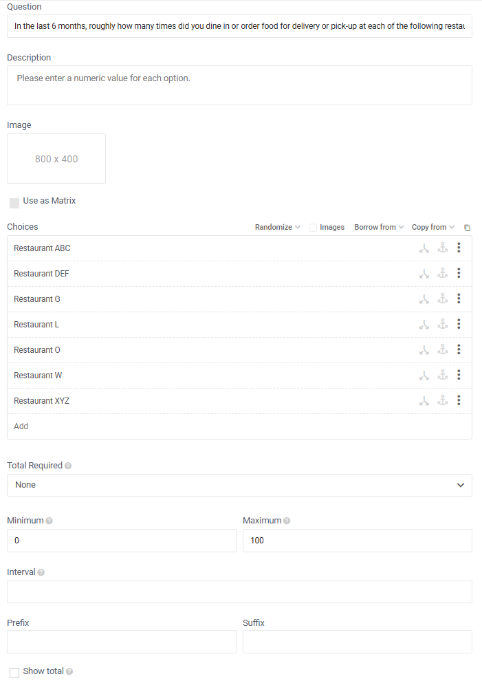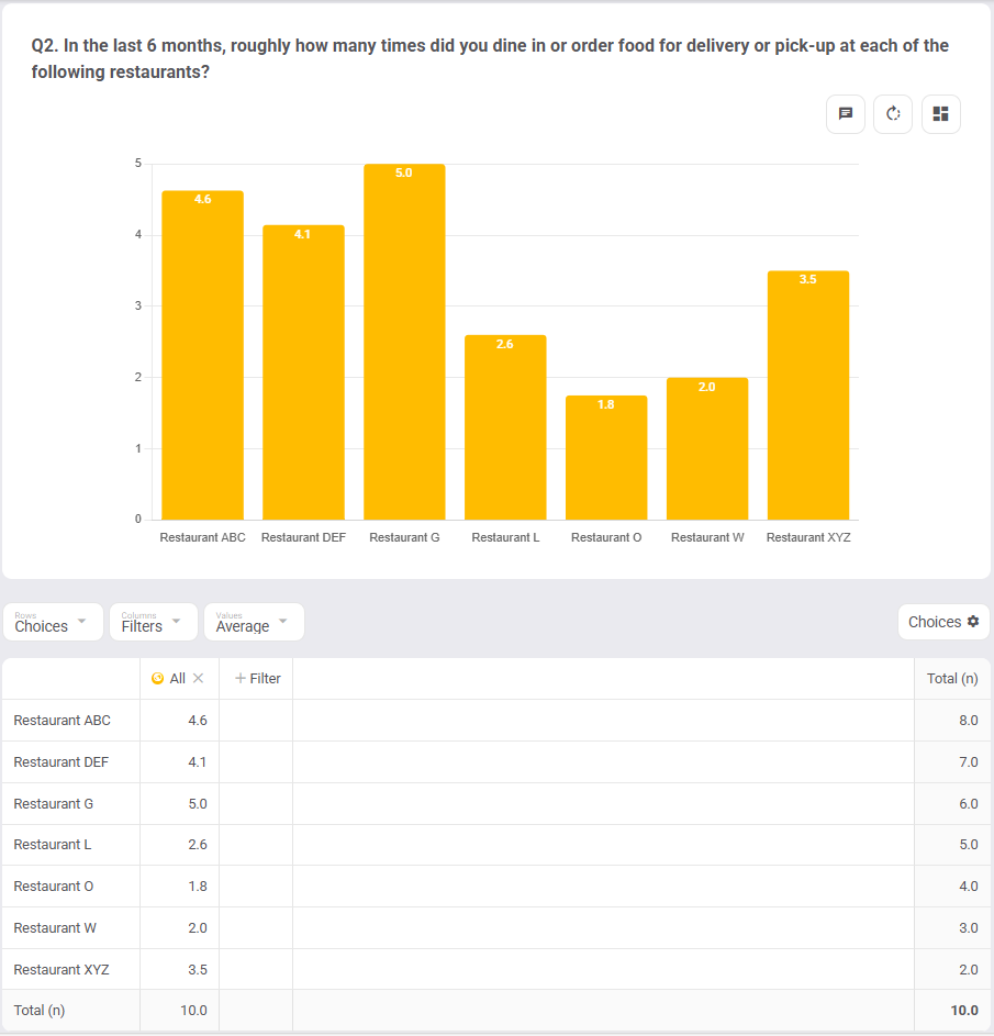 Below however, is the simplest Constant Sum: Choice view. We can see that at Q2, of the respondents who visited each restaurant more than 0 times in the last 6 months: